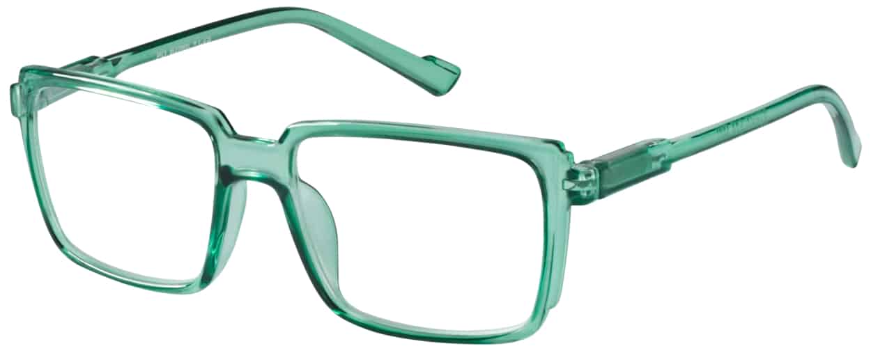 On trend modern rectangular frame in translucent mint green with matching arms. Frames made from recycled RPCTG material. Supplied with a recycled material slip in case.