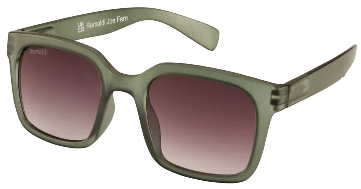 Remaldi quality sunglasses with full UV400 protection. Modern square frame in a matt green finish with matching arms. UV400 filter category 3 dark tint lenses providing high protection from sun glare. Supplied with a recycled material slip in case for safekeeping.