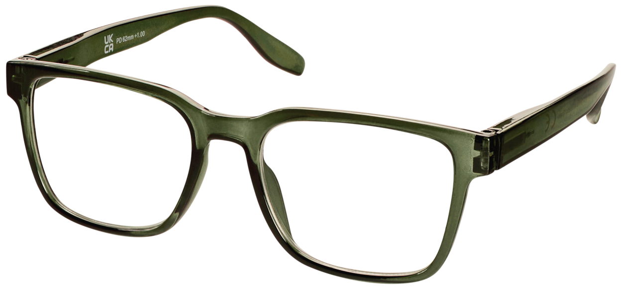 On trend bold frame in gloss khaki green with matching arms. A wearable everyday style. Quality reading lenses.