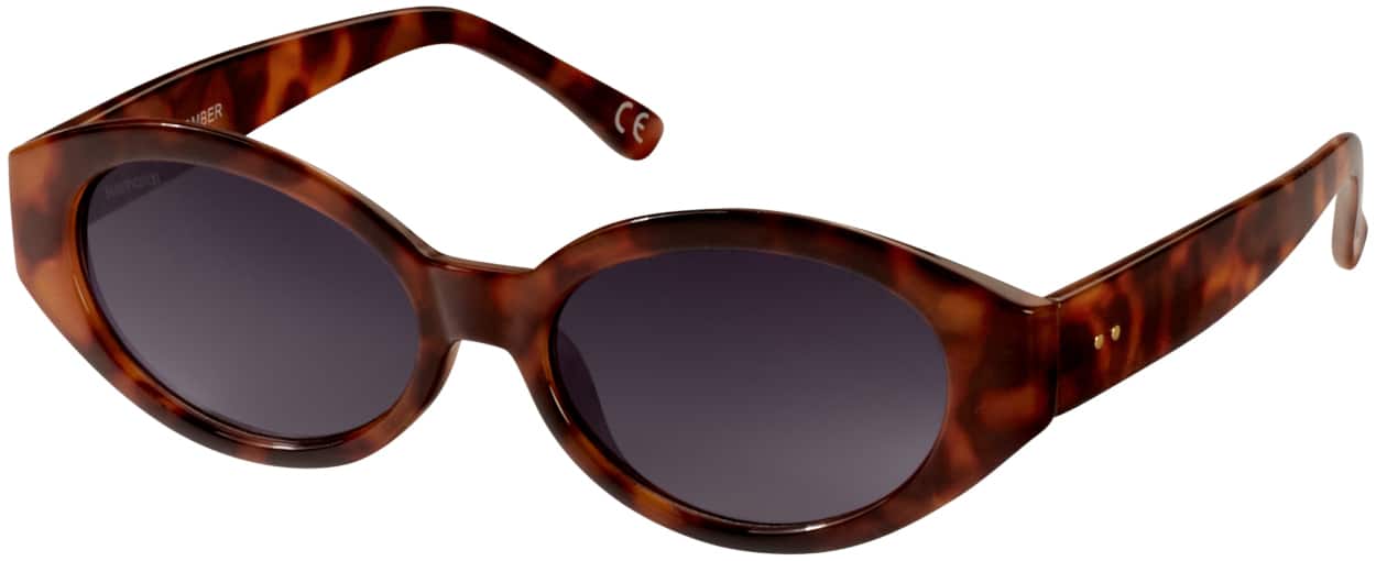 Cute oval frame in amber tortoiseshell with graduated lenses. Full UV400 protection. Category 3 lenses for bright sunny conditions. Made from recycled RPCTG material. Supplied with a recycled fabric slip in case.
