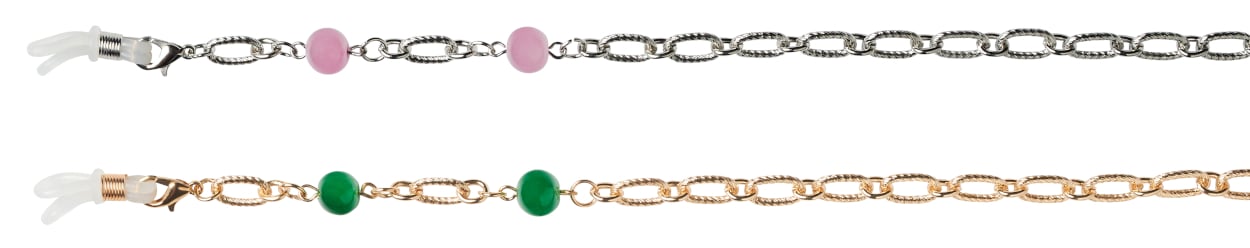 Never lose your glasses again with our new glasses accessory! Just attach to the arms of your frame, place over your head and you'll always have your specs to hand, as well as looking bang on trend! Contemporary chain in a silver finish with gloss pink beads. Lobster clasp fastenings and double rubber optical loops. Nickel free. Suitable for most frames - specs, readers, sun readers and sunglasses. We've doubled up on the adjustable loops so the loops stay in place and you get a secure fit on your glasses! Loops are also removeable so chain can be used alone. Length 68 cm (between optical loops).