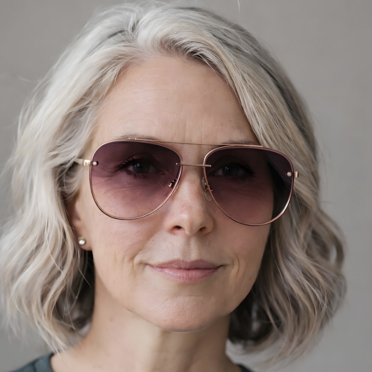 Classic aviator style sunglasses with bevelled edge, featuring clear tips and adjustable nose pads. Lightweight polycarbonate lenses with full UV400 protection.